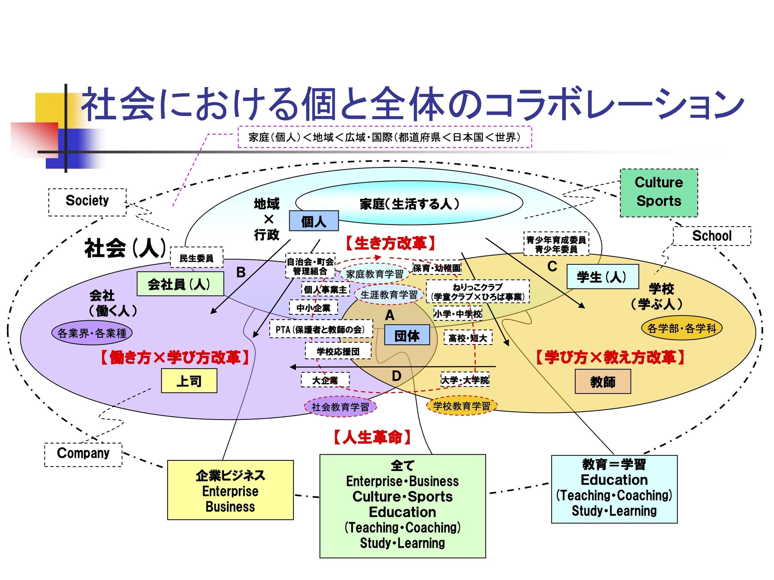「子どもが変われば親が変わる、親が変われば先生が変わる、人びとが変わればまちが面白くなる」という“人と環境・教育”をベースに置いた思考と行動の理念に基づいた、3世代つながる×地域スポーツ文化(知・徳・体)活動を核としたまちづくりに貢献することにより、学校×行政×企業ともに世代×時代ごとに「自立と連携」を繰り返しながら成長・発展していく世のなか「世界」を望んでいます。